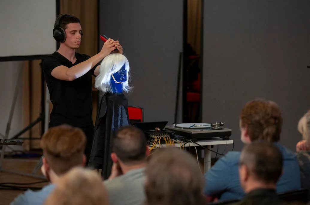 Divine cut is an electroacoustic piece for fixed media & live haircut. Starting as an artistic take on the classic 'binaural haircut', the composition expanded into an exploration on the viral phenomena of ASMR (autonomous sensory meridian response) videos online. Having you hair cut is a strange intimate ritual, there are not many setting where stare at ourselves in a mirror for 20-30 mins while a stranger wields sharp utensils at close proximity to our head. The micro sound-pallet from the utensils with the realistic proximity rendered by the binaural head create a somewhat un-easy intimacy between the performer and audience. Drawing parallels between the intimate sound collages of ASMR and micro-sound montage techniques used in acousmatic music long before the (ASMR) term was coined, Divine Cut re-introduces the sonic and theatrical aspects of these videos within an electroacoustic framework.